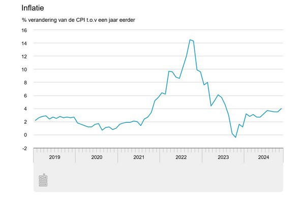 Consumentengoederen en -diensten waren in november 4,0 procent duurder dan een jaar eerder, meldt het CBS. In oktober was de inflatie 3,5 procent. De inflatie wordt elke maand gemeten als de ontwikkeling van de consumentenprijsindex (CPI) ten opzichte van dezelfde maand in het voorgaande jaar. Het inflatiecijfer van november is hetzelfde als bij de snelle raming die op 29 november is gepubliceerd.