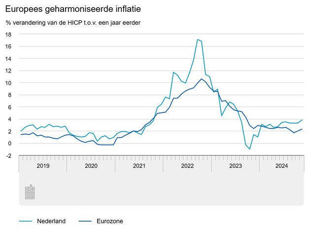 Het CBS publiceert twee verschillende cijfers voor inflatie. Een op basis van de consumentenprijsindex (CPI) en een op basis van de Europees geharmoniseerde consumentenprijsindex (HICP). Consumentengoederen en -diensten in Nederland waren volgens de HICP in november 3,8 procent duurder dan in dezelfde maand vorig jaar. In oktober was de inflatie volgens de HICP 3,3 procent. De inflatie in de eurozone nam toe van 2,0 procent in oktober naar 2,3 procent in november. Het komt vooral door de prijsontwikkelingen van diensten en tabaksproducten dat de inflatie in Nederland hoger is dan in de eurozone.
