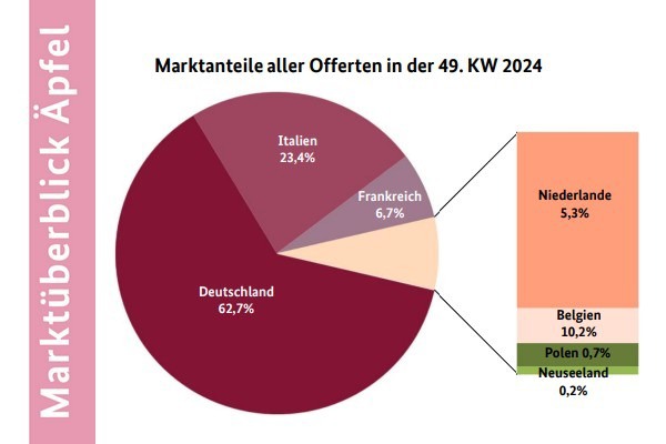 Binnenlandse aanbiedingen, vooral Elstar, Royal Gala, Jonagold, Boskoop en Braeburn, vormden zoals gebruikelijk in deze tijd van het jaar de basis van het assortiment in de Duitse handel. Daarna volgden de Italiaanse leveringen, vooral Golden Delicious en Granny Smith. Red Delicious waren volgens BLE vooral populair tijdens de Sinterklaasweek vanwege hun mooie kleur en konden snel worden verwerkt. Net als in voorgaande weken ging het in Frankrijk vooral om Jazz en Pink Lady, die over het algemeen snel werden verkocht. Wellant en Elstar kwamen uit Nederland en Boskoop uit België. Zendingen uit Polen speelden slechts in geïsoleerde gevallen een kleine rol. Import van overzee was bijna volledig uit het assortiment verdwenen.