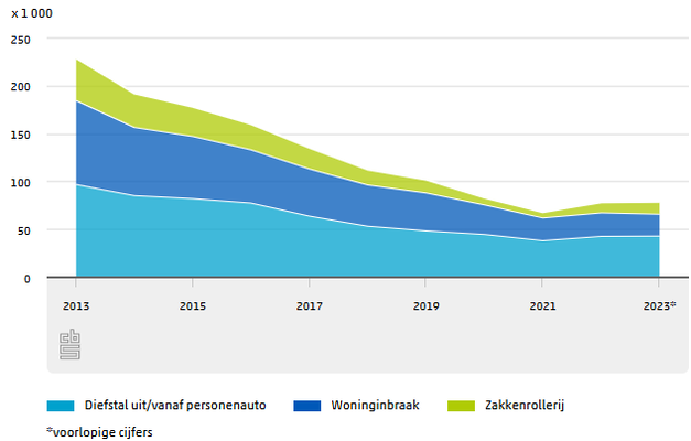 In 2023 zijn 807 duizend misdrijven geregistreerd door de politie. Tien jaar eerder waren dit nog 1,1 miljoen misdrijven, een daling van 27 procent. In Groningen en Utrecht daalde het aantal geregistreerde misdrijven het minst (23 procent) en in Flevoland het meest (35 procent). Vooral het aantal vermogensmisdrijven, zoals diefstal, daalde. Dat meldt het CBS op basis van cijfers over geregistreerde misdrijven.