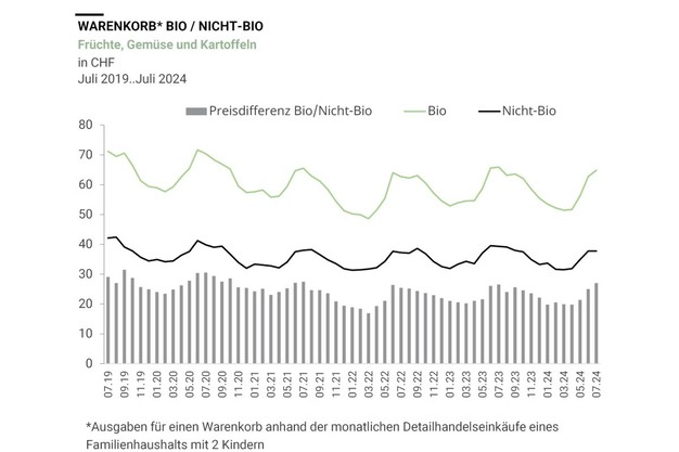 In Zwitserland heeft de biologische landbouw de afgelopen jaren een hoge vlucht genomen. De totale verkoop steeg vorig jaar naar een nieuw recordniveau. Een analyse van de prijzen van een mandje producten in de Zwitserse retail laat een licht stijgende trend zien voor biologische en niet-biologische producten tussen juli 2019 en juli 2024. Dit resulteert in een bijna onveranderd prijsverschil tussen biologische en niet-biologische producten. In de onderzochte periode was het mandje biologische producten gemiddeld 56,4 procent duurder dan het mandje niet-biologische producten.