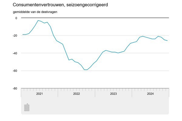 De stemming onder consumenten is in december negatiever dan een maand eerder, meldt het CBS. Het consumentenvertrouwen kwam in december uit op -26. In november was dat -25. Zowel het oordeel over het economisch klimaat als de koopbereidheid verslechterde. Het herstel van het consumentenvertrouwen stokte afgelopen jaar. Consumenten waren aan het eind van 2024 nauwelijks minder negatief dan aan het begin.
