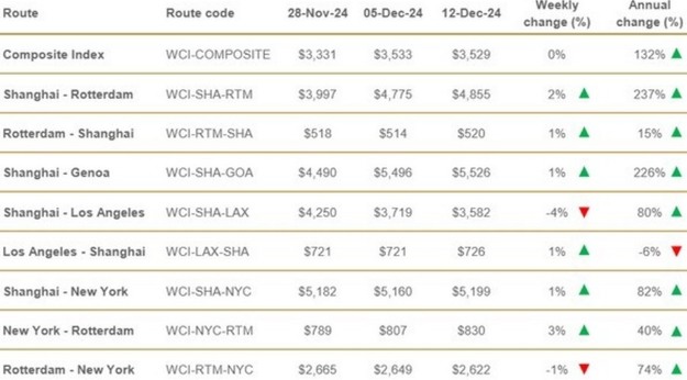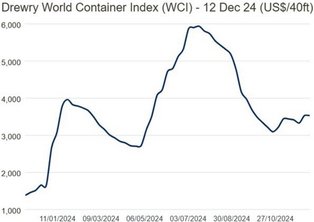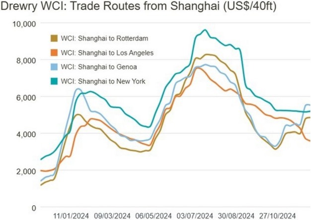 Drewry verwacht dat de tarieven op de trans-Pacifische routes de komende week zullen stijgen. Dit wordt toegeschreven aan anticiperende vrachtbewegingen in aanloop naar de geplande ILA-havenstaking in januari 2025 en de verwachte tariefsverhogingen onder de nieuwe Trump-regering.