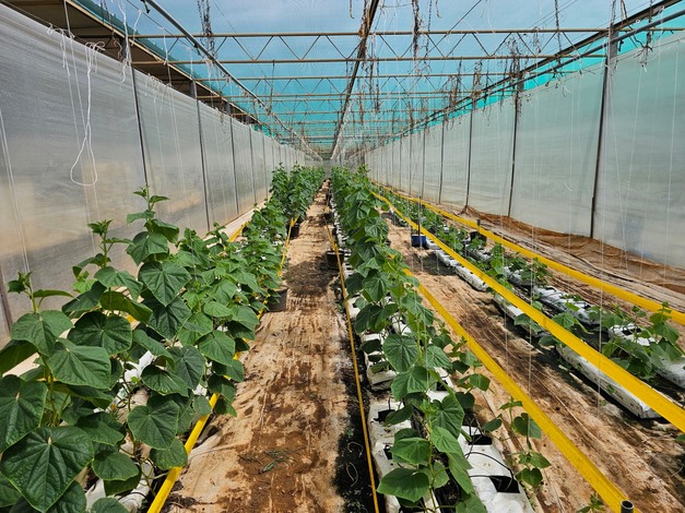De constant hoge temperatuur van rond de 33 graden is de grootste uitdaging in de teelt. "Ook het irrigatiewater warmt overdag flink op zodat we de planten bij voorkeur 's ochtends vroeg en 's avonds laat bewateren. Ook overdag wordt geïrrigeerd, maar dan moet er continu rekening worden gehouden met de temperatuur van het water", aldus Adrian. "Op het midden van de dag gaan de bladeren van de komkommer helemaal slap staan, 's avonds trekken ze dan weer bij. Water koelen doen we niet en we hebben ook geen ventilatoren hangen in de kas, want dan zit je met de kosten van elektriciteit. De wind die door de kas waait, zorgt voor de nodige afkoeling."