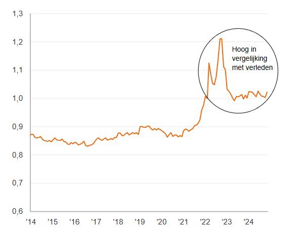 Wat Trump gaat doen, bijvoorbeeld met handelsbeleid, is nog zeer onzeker. Wat de Nederlandse inflatie betreft, lijkt het beeld duidelijker. ING Research acht het zeer aannemelijk dat de inflatie (en daarmee ook de consumentenverwachting over inflatie) nog geruime tijd hoog blijft. Onder andere door de invloed van belasting- en accijnsverhogingen, ruim begrotingsbeleid en krapte op de woning- en arbeidsmarkt blijft de inflatie niet alleen in 2025, maar daarna naar onze inschatting nog ongebruikelijk hoog. Recent is ook te zien dat de voedselinflatie weer wat een het toenemen is en de inkoopprijs van energie op groothandelsmarkten is ook weer wat hoger. Dat kan er allemaal voor zorgen dat de consument bovengemiddelde inflatie blijft verwachten en relatief veel blijf sparen. Zo zullen waarschijnlijk niet alle verwachte inkomensstijgingen de komende tijd volledig worden uitgegeven en blijven onze verwachtingen voor 2025 over de consumentenbestedingen gematigd.