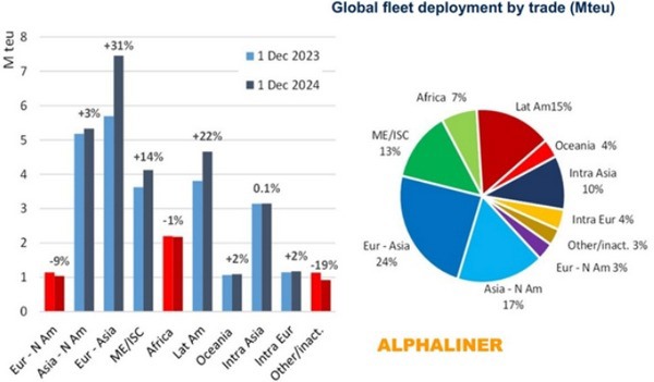 De wereldwijde containervloot is uitgebreid met bijna drie miljoen TEU-slots in de afgelopen 12 maanden, zo rapporteert Alphaliner. Een aanzienlijk deel van deze toegenomen capaciteit, ongeveer 1,76 miljoen TEU of 59%, werd gebruikt door de handel in Aziƫ-Europa. Deze toename in de vraag naar extra schepen wordt toegeschreven aan de omleiding van diensten via Kaap de Goede Hoop, een strategische zet om de gevaarlijke doorgang door de Rode Zee te omzeilen.