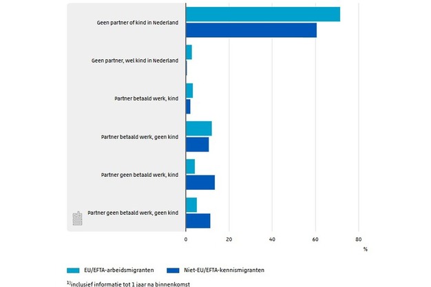 De meeste EU/EFTA-arbeidsmigranten (72 procent) en kennismigranten (62 procent) wonen een jaar na aankomst in Nederland alleen; ze staan niet met partner of kind geregistreerd op een Nederlands adres. 25 procent van de arbeidsmigranten woonde bij aankomst in Nederland met een partner, bij kennismigranten was dat 38 procent. 16 procent van de EU/EFTA-arbeidsmigranten en 13 procent van de kennismigranten van buiten de EU/EFTA had een partner met betaald werk. Meestal wonen zij in Nederland zonder kinderen.