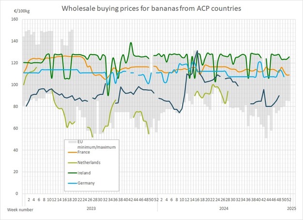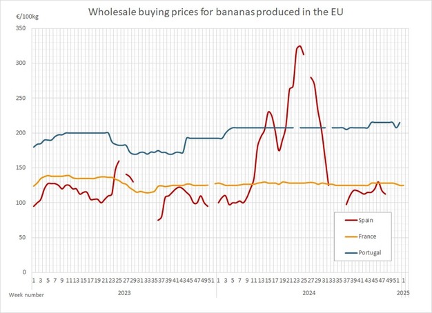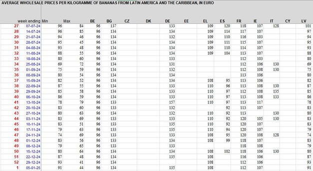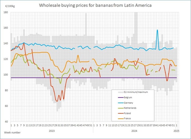 België bleef stabiel, met prijzen die onveranderd bleven op €96 in beide weken. Ook Bulgarije bleef de bananenprijs stabiel op €134, wat een consistente dynamiek van vraag en aanbod weerspiegelt.