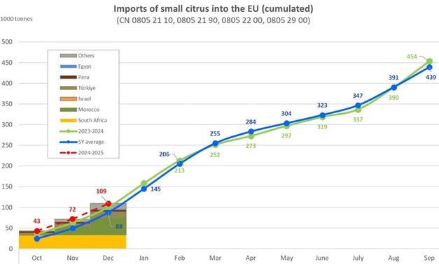 De import van mandarijnen bedroeg 109.362 ton tijdens het eerste kwartaal van het seizoen 2024/25. Marokko was de grootste leverancier met 41.657 ton, gevolgd door Zuid-Afrika met 33.384 ton. De gemiddelde prijs in december bedroeg €119 per 100kg, hoger dan de €112 van het vorige seizoen. Italië meldde de hoogste prijzen met €163 per 100 kg, wat duidt op een sterke vraag naar citrus van topkwaliteit.
