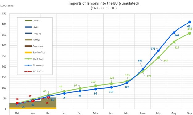De import van citroenen daalde tussen oktober en december 2024 tot 54.949 ton, vergeleken met 67.616 ton in dezelfde maanden van het vorige seizoen. Turkije bleef de dominante exporteur met 39.771 ton. De gemiddelde citroenprijs daalde in december tot €117 per 100 kg, waarbij Spanje en Italië hogere prijzen handhaafden van respectievelijk €119 en €122 per 100 kg.
