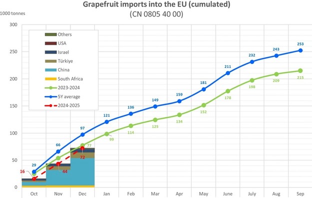 De import van grapefruit bereikte 72.195 ton tijdens de verslagperiode. China voerde de keten aan met een export van 50 835 ton, gevolgd door Turkije (10 633 ton) en Israël (5 411 ton). De gemiddelde prijzen in de EU daalden licht tot €117 per 100 kg in december, waarbij aanzienlijke bijdragen van premium leveranciers hielpen om de kwaliteitsnormen te handhaven.