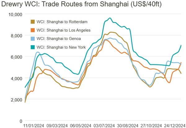 De vrachtkosten van New York naar Rotterdam en Rotterdam naar New York daalden met 1% tot respectievelijk $719, $828 en $2.698 per 40ft container. De ILA en USMX hebben een voorlopig akkoord bereikt, waardoor een dreigende havenstaking in januari is afgewend. Desalniettemin verwacht Drewry dat de tarieven op de Transpacifische route de komende week zullen stijgen, gedreven door frontloading in de aanloop naar de verwachte tariefverhogingen onder de aankomende Trump-regering.