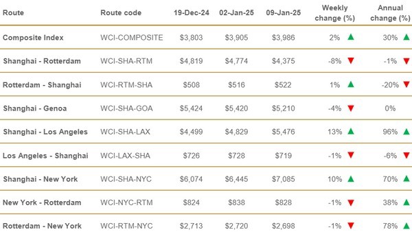 Vrachttarieven van Shanghai naar Los Angeles stegen met 13% of $647 tot $5.476 per 40ft container en die van Shanghai naar New York met 10% of $640 tot $7.085 per 40ft container, terwijl die van Rotterdam naar Shanghai met 1% of $6 stegen tot $522 per 40ft container. Daarentegen daalden de tarieven van Shanghai naar Rotterdam met 8% of 399 dollar tot 4.375 dollar per 40ft container en die van Shanghai naar Genua met 4% of 210 dollar tot 5.210 dollar per 40ft container. Hetzelfde geldt voor de tarieven van Los Angeles naar Shanghai,