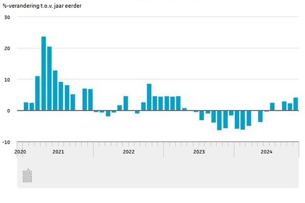 Het volume (werkdaggecorrigeerd) van de goederenexport was in november 4,2 procent groter dan in november 2023, meldt het CBS. Vooral de uitvoer van voeding- en genotsmiddelen, chemische producten, machines en apparaten was hoger. Het volume van de goederenimport was in november 1,8 procent groter dan in november 2023. Er zijn vooral meer aardolieproducten, chemische producten, transportmiddelen en elektrotechnische machines en apparaten ingevoerd.
