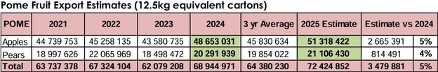 Het Zuid-Afrikaanse appelexportseizoen 2024 werd afgesloten met een recordhoeveelheid van 48,6 miljoen kartons (à 12,5 kg), wat een stijging van 12% vertegenwoordigt ten opzichte van het seizoen 2023. Voor het exportseizoen 2025 wordt een groei van 5% verwacht ten opzichte van de volumes van 2024. Deze stijging in exportvolumes is het resultaat van een toegenomen teelt, mede dankzij jonge boomgaarden die nu in productie komen, variëteiten met een hogere opbrengst, en het herstel van de schade veroorzaakt door hagel en overstromingen in 2023. Daarnaast spelen gunstiger weersomstandigheden een belangrijke rol in de positieve vooruitzichten.