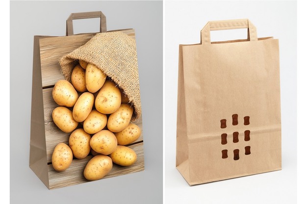 Links: Bedrukte aardappeldraagtas. Rechts: Aardappeldraagtas met perforaties