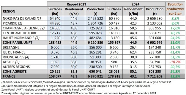 De areaaluitbreiding voor bewaaraardappelen (+11%) tot 178.900 hectare, volgens de laatste cijfers van landbouwstatistiekdienst Agreste, heeft bijgedragen aan deze groei. Ondanks de uitdagingen van een bijzonder nat en zwaar seizoen voor telers, blijft de opbrengst toenemen. Na een rampjaar in 2022 en een duidelijk herstel in 2023, ligt de oogst van 2024 weer op het tienjarig gemiddelde. Het bruto-opbrengstgemiddelde in Frankrijk bedraagt 43,1 ton per hectare, en zelfs 44,5 ton per hectare in kernregio's zoals Picardiƫ, Nord-Pas-de-Calais, Champagne-Ardenne, Centre en Haute-Normandie.