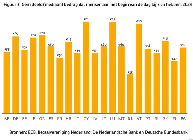 Gemiddeld hebben Europeanen 59 euro op zak aan het begin van de dag. De doorsnee Nederlander heeft het minste contant geld op zak: 35 euro. In 2022 was dat nog 46 euro. Samen met Finland en Frankrijk is Nederland een van de drie landen waar mensen 50 euro of minder op zak hadden. Cyprioten en Luxemburgers hebben het meeste geld aan het begin van de dag in hun portemonnee: 82 euro.