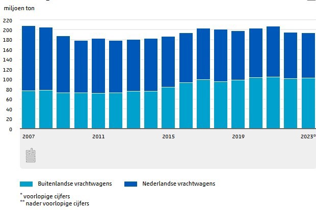 In 2023 werd voor 194 miljoen ton goederen over de weg vervoerd vanuit of naar Nederland. Iets meer dan de helft van deze goederen (53,1 procent) werd vervoerd door buitenlandse vrachtwagens. De afgelopen jaren vervoerden buitenlandse vrachtwagens steeds meer goederen. In 2023 vervoerden zij voor het vierde jaar op rij meer goederen dan Nederlandse vrachtwagens.