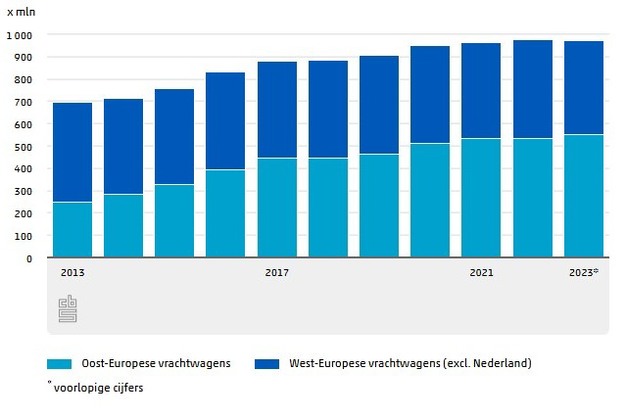 De laatste jaren is er een sterke toename van het goederentransport door Oost-Europese vrachtwagens van of naar Nederland. In 2023 vervoerden zij 55,4 procent van het vervoerde gewicht (57 miljoen ton goederen), in 2007 was dat 19,4 procent (15 miljoen ton).