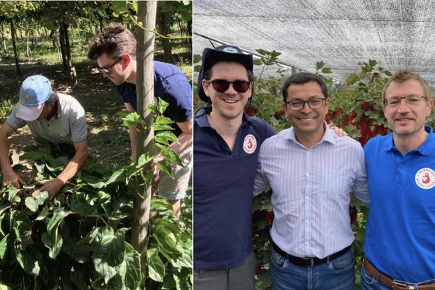 Jan Henrik zum Felde en Stephan Kratzer bezoeken de plantage van telerspartner Cesar Gomez (midden) in Chili.