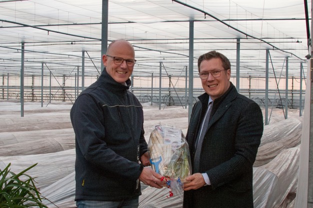 Rik Kursten van Teboza reikt een aspergepakket uit aan burgemeester Bob Vostermans