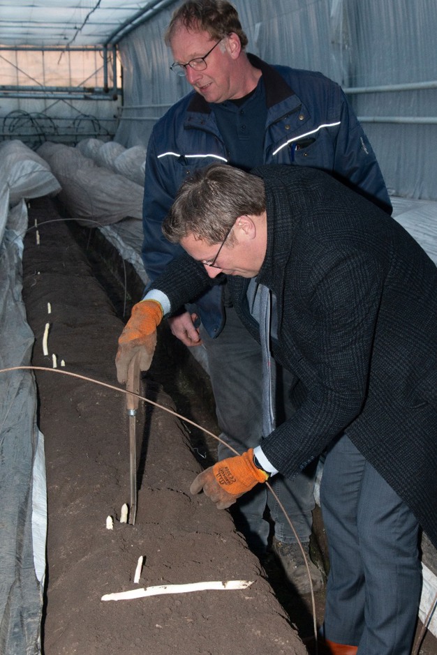 Onder begeleiding van een van de medewerkers van het teeltteam steekt de burgemeester symbolisch de eerste Nederlandse kasasperge