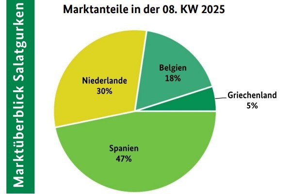 De Spaanse aanvoer van komkommers domineerde de markt en overtrof die van Nederland. Belgische zendingen vormden een aanvulling op het aanbod, terwijl er ook enkele Griekse leveringen beschikbaar waren in München. Over het algemeen bleef de beschikbaarheid beperkt, vooral doordat de Spaanse leveringen afnamen, mogelijk als gevolg van recente promoties in de detailhandel. Volgens de BLE kon hierdoor niet overal aan de vraag worden voldaan, wat leidde tot stijgende prijzen.