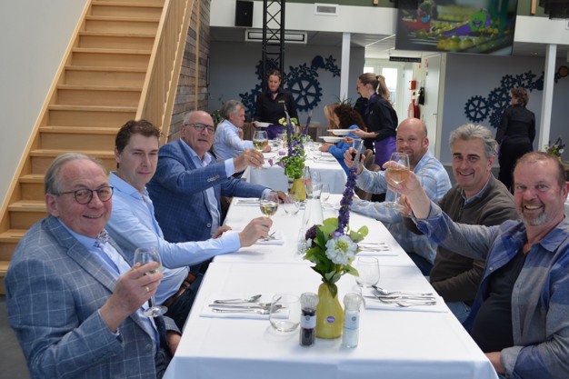 © Marjet Lubbers-Bruijnse | AGF.nlJan Timmermans (Adviseur Xenia), Jacco van Kessel (Kessel fruit), Henny van Kooten voorzitter Xenia Europe en interim-voorzitter NFO), Wilco Brokken (fruit en boomkwekerij bBrokken), Marius van Arkel (Van Arkel Fruit) en Herman van Linge (Maatschap van Ingen) toasten op Xenia