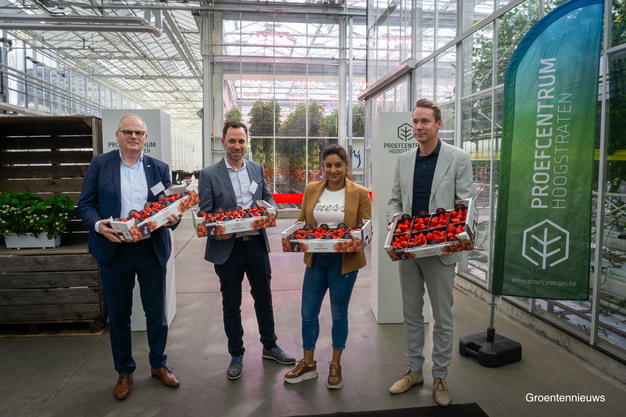 Tholen - De aardbeienteelt mag de laatste jaren wereldwijd onder de aandacht liggen, maar de eerste onderzoeksfoto's van Proefcentrum Hoogstraten naar aardbeienteelt op substraat zijn nog in zwart-wit. Het Vlaamse onderzoekscentrum doet namelijk al meer dan zestig jaar onderzoek naar de teelt van aardbeien, en voert al zeventig jaar proeven uit met tomaten. Afgelopen zaterdag werd aan die rijke geschiedenis een nieuw hoofdstuk toegevoegd, toen Hans Vanderhallen en Tom Van Delm van het Proefcentrum, samen met minister van Landbouw Jo Brouns en gedeputeerde Jinnih Beels, de nieuwe serres officieel openden. "Met 0,2 procent van de landbouwgrond staat de tuinbouw voor een productiewaarde van een half miljard. De top bereiken is één ding, die positie behouden een ander. Daarvoor heb je mensen nodig die kennis willen delen, en het toppunt van infrastructuur", sprak de minister.