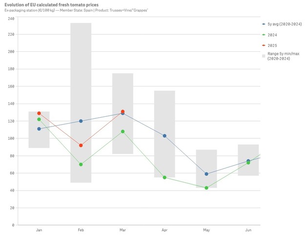 De gemiddelde prijs voor trostomaten in Spanje lag op het hoogste niveau in 5 jaar tijd in maart.
