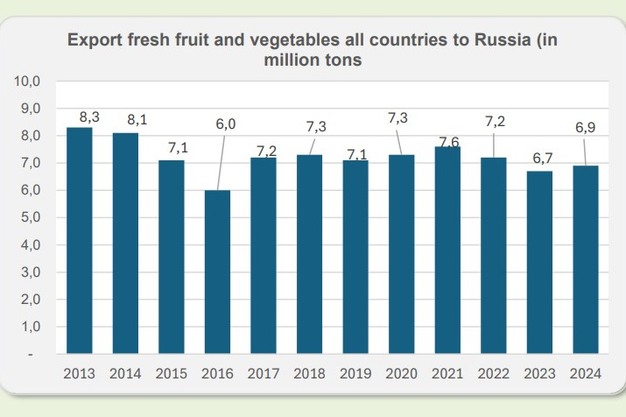 Afgaande op de exportcijfers van alle landen naar Rusland is de Russische import in de laatste twee jaar kleiner geweest dan daarvoor. Voor de boycot in 2014 importeerde Rusland meer dan 8 miljoen ton verse groenten en fruit. De jaren daarna daalde die volgens de Russische import statistiek naar 6,8 miljoen ton in 202 en 2021. Op basis van exportcijfers zou in de jaren 7,2 tot 7,5 miljoen naar Rusland zijn uitgevoerd. Daarna daalde de import naar minder dan 7 miljoen ton.