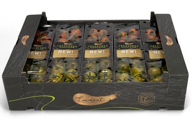 Tholen - FV Seleqt introduceert een nieuwe premium range met gekleurde troscherrytomaten. De lijn bevat de troscherrytomaten in de kleuren zwart, olijfgroen, oranje en ivory, waarbij de laatste tussen wit en geel inzit. Het ras is afkomstig uit de 'eigen' tuin van Eminent Produce waar tal van nieuwe tomatenrassen worden getest. "We hebben vanaf week 21 een beperkt volume van zo'n drie tot vier pallets per week beschikbaar, maar willen als de lijn aanslaat graag verder opschalen", vertelt product manager Norman van Domburg. "Deze lijn, die we onder ons merk Eminent op de markt brengen, past perfect binnen dit onderscheidende brand."