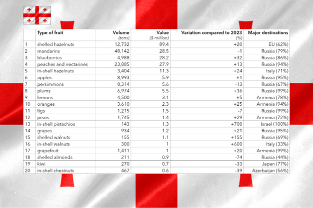 Georgisch fruit en noten werden uitgevoerd naar 58 landen, met als grootste afnemers Rusland (42%), EU-landen (29%; hoofdzakelijk Italië, Spanje, Duitsland, Frankrijk en Polen) en buurland Armenië (11%). Ter vergelijking: Griekenland voerde vorig jaar fruit uit ter waarde van €1,3 miljard ($1,4 miljard), zes keer zoveel.