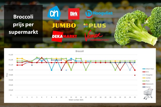 Na een week afwezigheid is broccoli in week 25 met een aanbieding opvallend terug in het onlineschap van DekaMarkt, voor 79 cent per 500 g. De vaste prijs blijft op het niveau van week 23, 1,29 euro. Dirk valt op met een prijsverlaging van 30 cent waardoor de vaste prijs uitkomt op 99 cent.