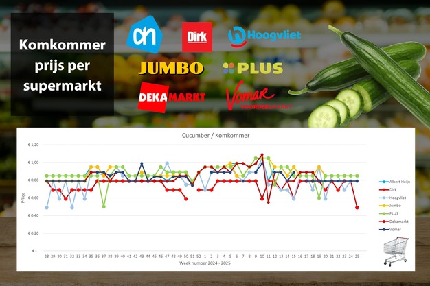 De laatste weken kropen de komkommerprijzen dicht tegen elkaar aan, echter Dirk komt in week 25 met een verrassend lage prijs van 49 cent per stuk in de aanbieding. De vaste prijs verlagen ze naar 59 cent per stuk, zo lijkt uit de analyse van Supermarktscanner.