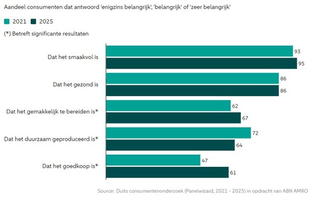 Smaak en gezondheid zijn belangrijk voor de Duitse consument. Pas daarna volgen aspecten zoals gemak, duurzaamheid en prijs. In de afgelopen vier jaar is de Duitse consument veel meer waarde gaan hechten aan prijs, blijkt uit een representatief consumentenonderzoek dat Panelwizard in opdracht van ABN AMRO in 2021 en 2025 heeft uitgevoerd onder meer dan 1.000 Duitse consumenten per meting.