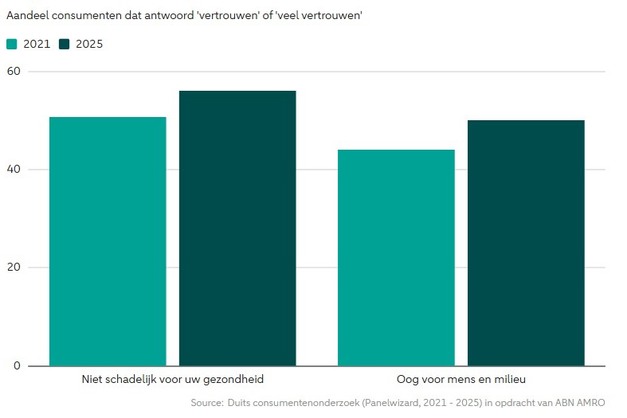 Het vertrouwen van Duitse consumenten in Nederlands voedsel, wat betreft gezondheid en de productie met oog voor mens en milieu, is de afgelopen jaren gegroeid, zie Figuur 2. Er was een stijging van respectievelijk 5 en 6 procentpunt in 2025 ten opzichte van 2021, ondanks zorgen over het gebruik van o.a. gewasbeschermingsmiddelen.