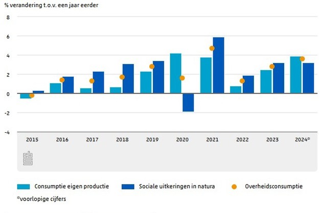 Anderzijds bestaat de consumptie uit sociale uitkeringen in natura. Deze groeiden in 2024 met 3,2 procent, gecorrigeerd voor prijsveranderingen. Het merendeel van de sociale uitkeringen in natura heeft betrekking op de zorg, onder andere via de Zorgverzekeringswet (Zvw), de Wet langdurige zorg (Wlz) en de kinderopvangtoeslag. Ook de huurtoeslag en het studentenreisproduct zijn onderdeel van de sociale uitkeringen in natura. Deze consumptie koopt de overheid in bij marktpartijen voor huishoudens, om financiële ondersteuning te bieden tegen risico's zoals ziekte, of om bijvoorbeeld te zorgen voor huisvesting.