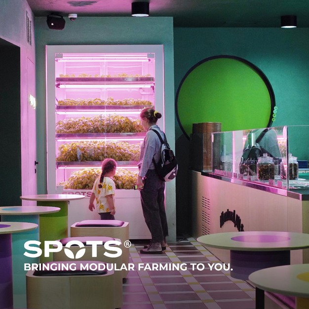 Na het succes van de vertical farm in het centrum van Tbilisi lanceerde Tusya 'Spots by SpaceFarms': compacte, volledig geautomatiseerde verticale teeltunits. Elk Spot beslaat slechts 2 m² en produceert 10-15 kilo bladgroenten per maand. "Perfect voor restaurants, hotels, appartementsblokken en zelfs kantoorruimtes", legt Tusya uit. "Wij leveren de zaailingen en een technicus komt twee keer per week langs."