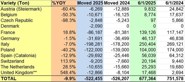 Op 1 juni 2025 bedroegen de appelvoorraden in de gecontroleerde Europese landen 677.364 ton, wat een afname van 9,9% betekende ten opzichte van de 751.578 ton op dezelfde datum in 2024. De grootste dalingen waren zichtbaar in Polen (-40,2%; 122.000 ton), Italië (-7,0%; 198.281 ton) en Frankrijk, waar de voorraden met 86.187 ton afnamen, ondanks een stijging van 18,8% op jaarbasis, als gevolg van een grotere afzet in 2025. Ook Oostenrijk, België en Tsjechië zagen aanzienlijke afnames in hun voorraden, met een daling van 60,4% in Oostenrijk en 98,3% in Tsjechië.