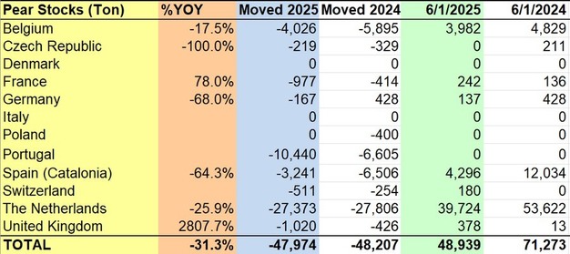 Op 1 juni 2025 bedroegen de Europese perenvoorraden 48.939 ton, wat een daling van 31,3% vertegenwoordigt ten opzichte van de 71.273 ton op dezelfde datum in 2024. Grote jaarlijkse dalingen werden in Spanje (Catalonië) gemeld, waar de voorraden afnamen van 12.034 ton tot 4.296 ton, een daling van 64,3%, en in Nederland, waar de voorraden met 13.898 ton zakten tot 39.724 ton, wat een afname van 25,9% betekent. Ook Duitsland noteerde een aanzienlijke daling van 68%, waarbij de voorraden daalden van 428 ton in 2024 naar 137 ton in 2025.