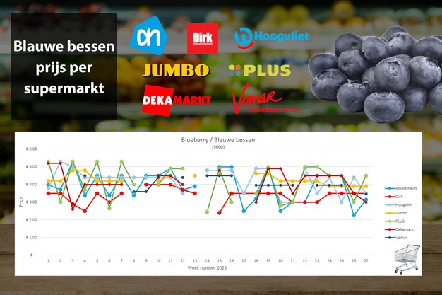 Prijsverschillen blijven opvallend in blauwe bessen. Er zijn weer diverse hoge afprijzingen in blauwe bessen, waarbij die van DekaMarkt het meest opvalt door de laagste prijs: 2,99 euro per 300 gram. Bij Albert Heijn blijven de bessen in promotie, maar de prijs ligt 90 cent hoger dan in week 26, en komt uit op 3,14 euro. Bij Plus betalen klanten het meest 4,49 euro.