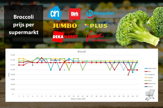 © Supermarktscanner.nl Voor de derde week op rij is Dirk flink goedkoper met broccoli. Met een verschil van 26 tot 36 cent onderscheiden ze zich van de rest waar broccoli in de schappen ligt met prijzen tussen 1,29 en 1,35 euro per stuk.