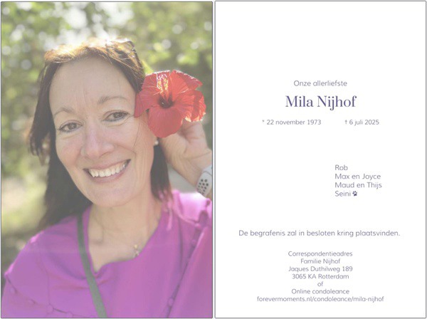 De begrafenis zal in besloten kring plaatsvinden. Condoleances kunnen gestuurd worden naar: Familie Nijhof, Jaques Duthilweg 189, 3065 KA Rotterdam of online via https://forevermoments.nl/condoleance/mila-nijhof/