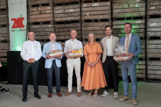 Karel Paesmans van Fruitsnacks, Lode Ceyssens voorzitter van Boerenbond, Dries Deferm burgemeester van Nieuwerkerken, Heidi Vanreppelen van Fruitsnacks, Roel Paesmans van Fruitsnacks, Jo Brouns Vlaams minister van Omgeving en Landbouw.