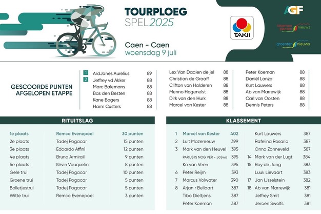 In het Takii Tourploegspel hebben we ook een nieuwe virtuele geletruidrager. Het is Marcel van Kester van BASF | Nunhems. Hij haalde gisteren 88 punten, net als een hele groep andere deelnemers. Het brengt zijn puntentotaal op 402, genoeg om de leiding over te nemen van Luit Mazereeuw die nu tweede staat.