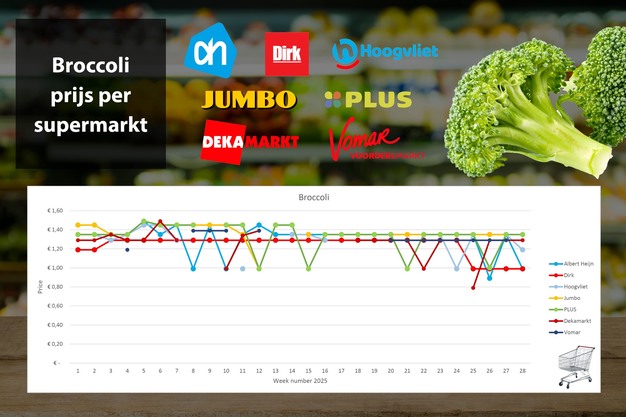 Dirk blijft met 99 cent voor broccoli flink goedkoper dan de andere onderzochte supermarkten. Albert Heijn matcht de prijs in week 28 met een aanbieding. Verder is er behoorlijke prijsdifferentiatie met prijzen voor 500 gram broccoli tussen de 1,19 en 1,35 euro.