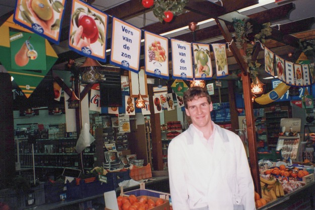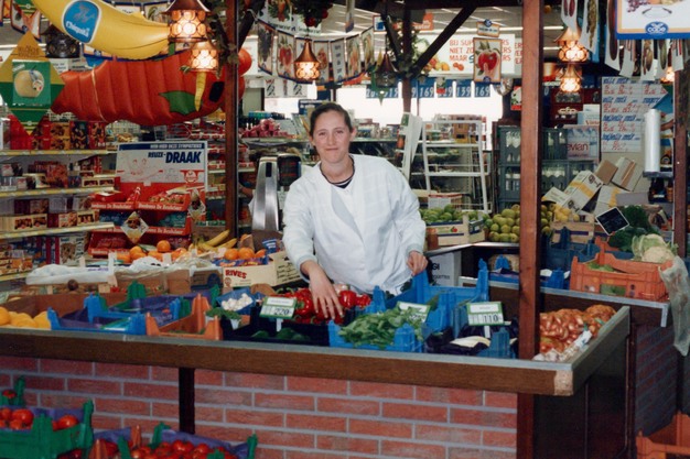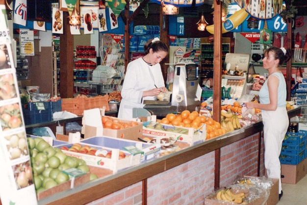 Peter van Laecke: "Groenten en fruit maken een belangrijk deel uit van onze totale omzet en daarom besteden we daar de uiterste zorg aan. Driemaal per week doen we inkopen op de groothandelsmarkt in Gent om de versheid van onze produkten op peil te houden. Op gezette tijden houden we acties waarbij we spaarpunten geven. Weliswaar ondervinden we hier in de naaste omgeving nogal wat concurrentie van gespecialiseerde groenten- en fruitzaken, maar die stimuleren ons juist om ons beste beentje voor te zetten."