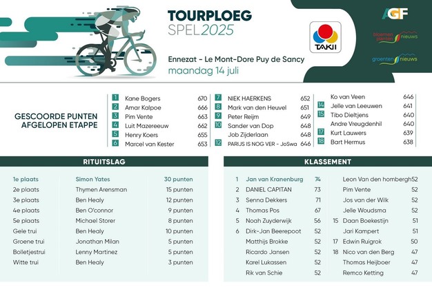 Jan van Kranenburg heeft maandag de dagzege gepakt in het Takii Tourploegspel. 4 van de 5 renners uit de kopgroep die aan de laatste klim begon zaten in zijn team. Simon Yates won de rit.